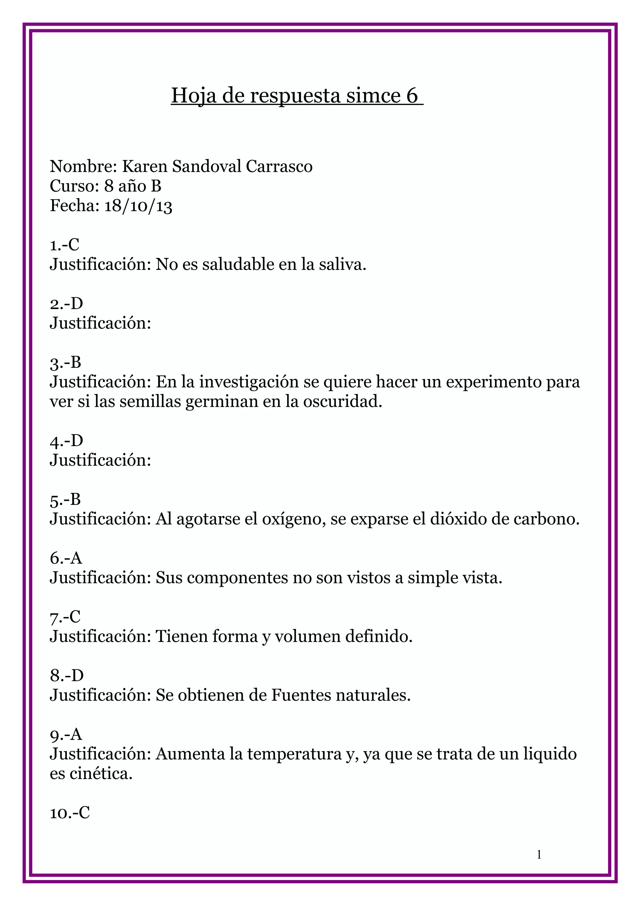 Este documento contiene las respuestas de Karen Sandoval Carrasco a las preguntas de una prueba SIMCE de 8o año básico. En total respondió 42 preguntas sobre diversos temas como biología, química y ciencias de la tierra. Para cada respuesta incluyó una breve justificación.
