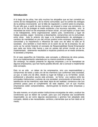El documento argumenta que los empresarios deben tener responsabilidad social. Explica que tradicionalmente se ha pensado que el rol de los empresarios y las empresas es generar utilidades sin considerar su responsabilidad con la sociedad. Sin embargo, ambos deben tener una visión más amplia de su impacto en la sociedad y trabajar de forma activa con el gobierno y la sociedad para mejorar la calidad de vida de las personas. Los beneficios de la responsabilidad social empresarial incluyen mayor productividad, lealtad de clientes y empleados, respaldo del