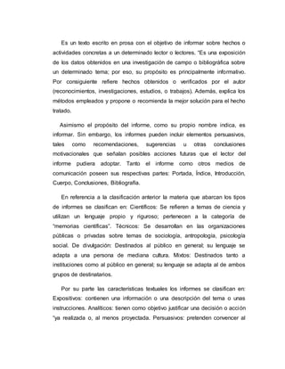 El documento define un informe como un texto escrito con el objetivo de informar sobre hechos o actividades de manera concisa. Explica que los informes pueden clasificarse como científicos, técnicos, de divulgación o mixtos dependiendo del tema y destinatario. También puede ser expositivo, analítico o persuasivo dependiendo del objetivo. Finalmente, destaca la importancia de fijar claramente el objetivo, recolectar y estructurar la información de manera coherente al elaborar un informe.