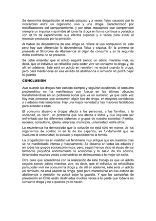 Este documento define la drogadicción como una enfermedad crónica que causa dependencia física y psicológica de las drogas. Explica que el consumo de drogas es cada vez más permisivo y fácil de obtener, lo que lleva a más personas a volverse adictas. También clasifica los tipos de drogas y describe los efectos físicos, psicológicos y sociales negativos de la drogadicción. Concluye que la drogadicción es un problema social creciente que requiere un esfuerzo comunitario para