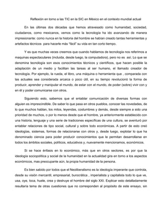 El documento discute el impacto de las tecnologías de la información y la comunicación (TIC) en México en el contexto mundial actual. Señala que las TIC han avanzado rápidamente en las últimas décadas y ahora juegan un papel fundamental en la vida cotidiana y la comunicación. Sin embargo, en México existe una "brecha digital" que limita el acceso a las TIC y su uso para fomentar el conocimiento. El documento también advierte sobre los posibles usos negativos de las TIC cuando son controladas por intereses comerciales en lugar