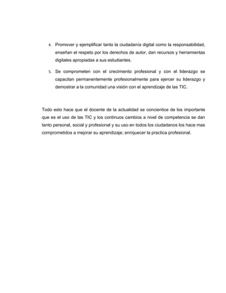Los Estándares Nacionales de Tecnologías de la Información y Comunicación para Docentes proporcionan una guía para que los maestros se mantengan actualizados en la era digital y enseñen a los estudiantes habilidades relevantes. Los estándares se organizan en torno a 5 categorías que incluyen inspirar a los estudiantes, diseñar experiencias de aprendizaje digitales, modelar el trabajo digital, promover la ciudadanía digital y comprometerse con el desarrollo profesional continuo. El documento enfatiza la importancia de que los ma