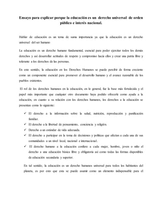 El documento habla sobre la educación como un derecho universal y de interés nacional. Explica que la educación es fundamental para el ejercicio de otros derechos y para desarrollar el respeto hacia ellos. También menciona que la educación en derechos humanos promueve el desarrollo humano. Finalmente, concluye que la educación en derechos humanos se percibe como un mecanismo esencial para promover el desarrollo humano de manera sostenible y una sociedad con tolerancia, libertad y respeto a los derechos humanos.