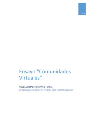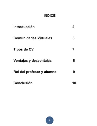 Este documento define las comunidades virtuales y discute sus características y tipos. Explica que las comunidades virtuales permiten la comunicación entre personas que comparten intereses y que se encuentran en diferentes lugares geográficos. Describe los roles del profesor y los estudiantes en las comunidades virtuales de aprendizaje.