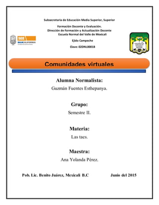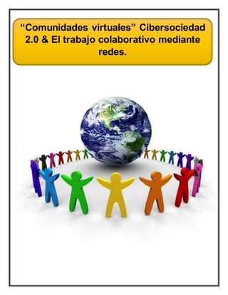 Este documento describe las comunidades virtuales y el aprendizaje colaborativo mediante redes. Explica que las comunidades virtuales permiten que las personas se conecten a través de Internet para discutir temas comunes y compartir información de forma similar a las comunidades físicas. También destaca que el aprendizaje colaborativo en línea puede unir a las personas para trabajar en grupo y aprender unos de otros a través de actividades participativas.