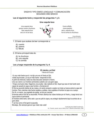 Este documento presenta un ensayo de lenguaje tipo SIMCE para segundo año básico. Contiene 10 preguntas sobre varios textos cortos como poemas, fábulas y noticias. Al final se incluye una tabla con las respuestas correctas a las preguntas planteadas.