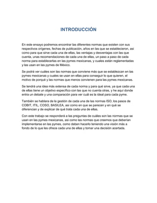 1) El documento describe varias normas relacionadas con la administración y gestión de sistemas de información y tecnologías, incluyendo ISO 27001, ISO 17799, COBIT, ITIL, COSO y ISO/IEC 20000. 2) También analiza cuáles de estas normas serían viables de implementar en una pyme mexicana, concluyendo que ISO 27001 e ISO 17799 son las más adecuadas debido a su flexibilidad y bajo costo de implementación. 3) Finalmente, resume los beneficios que brindan normas como COB