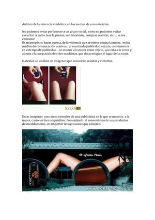 El documento describe y analiza la violencia simbólica contra la mujer en los medios de comunicación, especialmente la publicidad sexista que la objetifica. Presenta ejemplos como publicidad de Axe que promueve la promiscuidad masculina y ve a la mujer como trofeo. El autor argumenta que este tipo de publicidad violenta los derechos de la mujer y fomenta roles de género dañinos. Concluye que aunque la violencia evoluciona con la tecnología, debemos rechazar esta visión misógina y luchar por la igualdad y respeto hacia