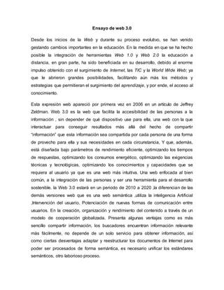 Este documento describe la evolución de la web y su impacto en la educación. Explica que la Web 3.0 facilita el acceso a la información sin depender del dispositivo, permite compartir información de manera útil para cada usuario y está diseñada para ser más intuitiva y eficiente. Además, la Web 3.0 utiliza inteligencia artificial y fomenta nuevas formas de comunicación entre usuarios para organizar y compartir contenido de manera cooperativa. Finalmente, el documento analiza el potencial de la Web 3.0 para mejorar las herramientas educ