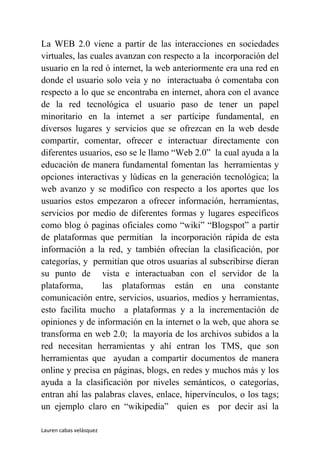 El documento habla sobre cómo la Web 2.0 ha permitido una mayor interacción entre usuarios a través de plataformas como blogs, wikis y redes sociales. Estas herramientas fomentan formas más lúdicas y colaborativas de aprendizaje. La educación debe aprovechar estas tecnologías para hacer la enseñanza más divertida y permitir a estudiantes y profesores pensar, escribir, compartir y adquirir conocimientos de manera grupal.