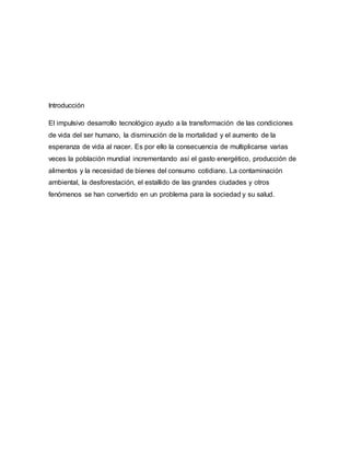 El documento discute el impacto ambiental negativo causado por el desarrollo tecnológico y la industrialización, incluida la contaminación, la degradación del suelo y el agua, y la pérdida de hábitats naturales. Argumenta que las empresas y organizaciones deben minimizar los efectos dañinos de sus actividades en el medio ambiente mediante el uso de nuevas tecnologías ecológicas y el cumplimiento de objetivos de reducción de emisiones. También enfatiza la necesidad de que las personas tomen conciencia de la prote