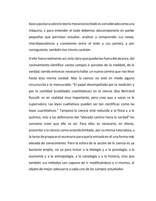 El documento discute el método científico y cómo algunos creen que está limitado a lo físico y cuantificable. Sin embargo, el autor argumenta que el método científico puede aplicarse a muchos campos como la biología, psicología, economía y más. Además, el conocimiento científico se basa en la observación sistemática y medición de la realidad, así como en la formulación y comprobación de hipótesis para comprender la esencia de las cosas de manera profunda.