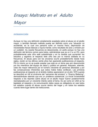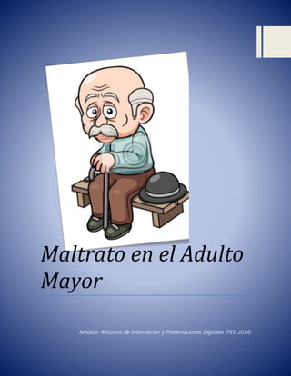 El documento describe el maltrato del adulto mayor, definido como daño físico, emocional o psicológico causado por un cuidador. Explica que el maltrato ocurre comúnmente en el hogar y es perpetrado por familiares o cuidadores. También identifica diferentes tipos de maltrato como físico, verbal, psicológico, financiero y abandono. Concluye enfatizando la importancia de prevenir el maltrato a través de educación pública y asistencia a cuidadores para aliviar el estrés.