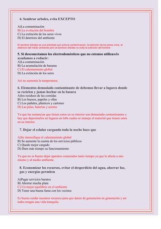 Este documento presenta un ensayo de ciencias naturales para 8o grado que contiene 10 preguntas sobre protección del medio ambiente. Las preguntas cubren temas como la responsabilidad de cuidar el ambiente, recomendaciones para protegerlo como evitar aerosoles y sembrar árboles, las causas del calentamiento global como el deterioro de la capa de ozono, y los beneficios de ahorrar recursos como permitir un mejor equilibrio ambiental y vida para generaciones futuras. El documento concluye resaltando que el ser humano es