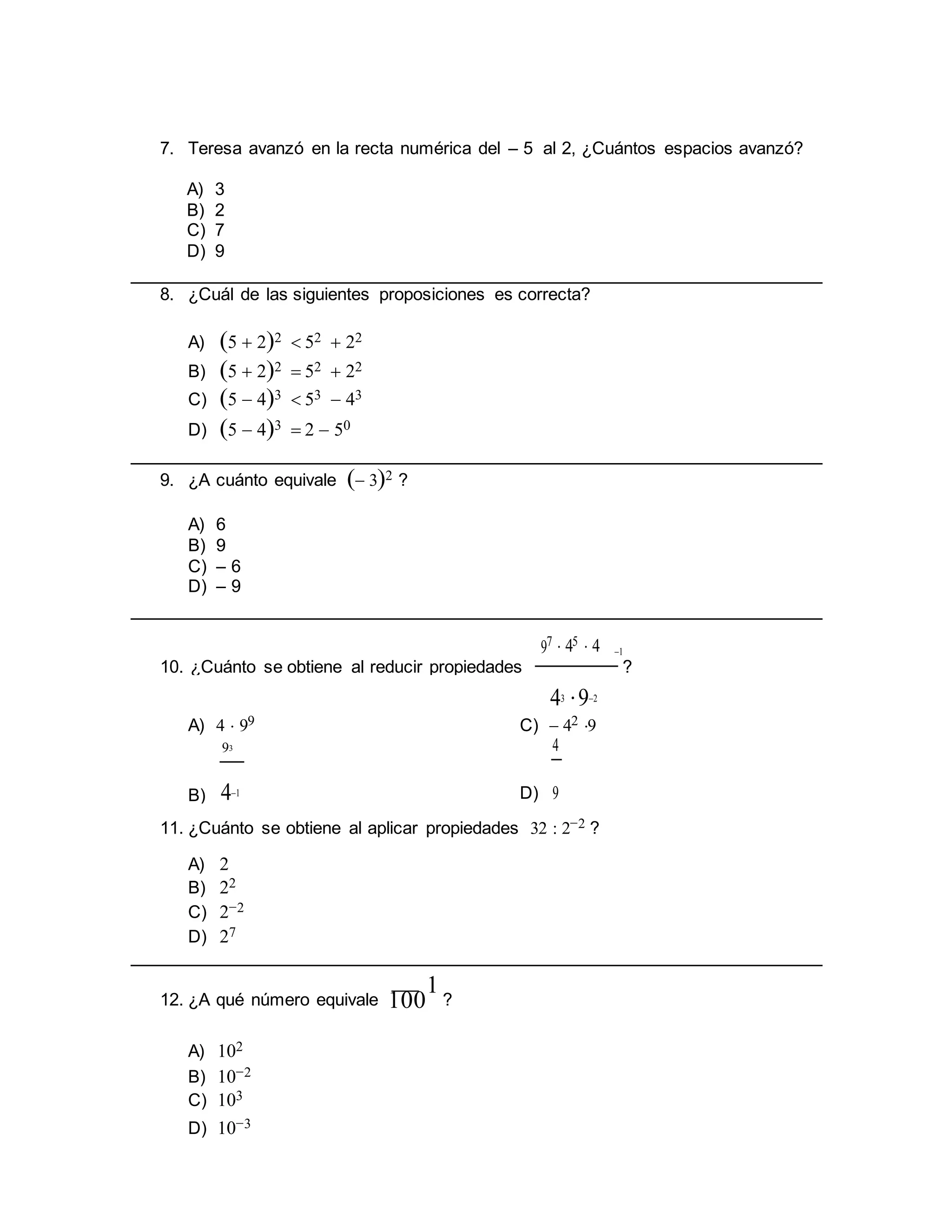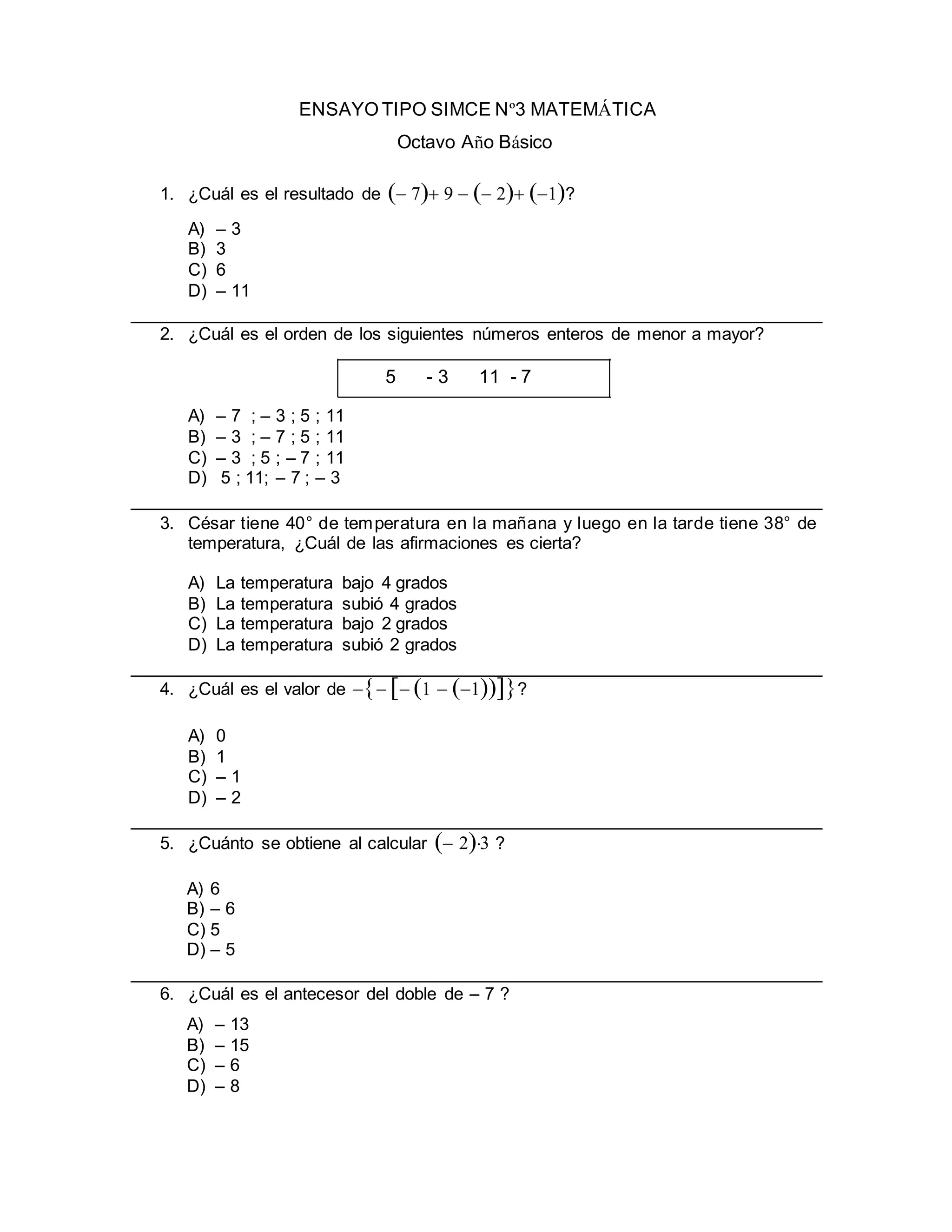 Este documento contiene 35 preguntas de opción múltiple sobre conceptos matemáticos como operaciones con números enteros y racionales, porcentajes, proporcionalidad directa, geometría plana y espacial, estadística y probabilidad. Las preguntas abarcan una variedad de temas matemáticos que se esperan que los estudiantes de octavo año básico comprendan y apliquen.