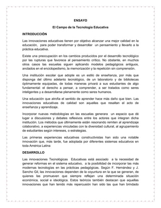 Este documento trata sobre las innovaciones educativas y tecnológicas. Explica que las innovaciones educativas de calidad son aquellas que mejoran la enseñanza y el aprendizaje al resaltar estos procesos. También describe cómo las nuevas tecnologías pueden usarse para crear entornos de aprendizaje y cómo las innovaciones educativas deben atender tanto los intereses de los maestros como de los estudiantes. Concluye diciendo que para lograr una educación de calidad, maestros y estudiantes deben usar materiales