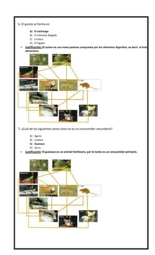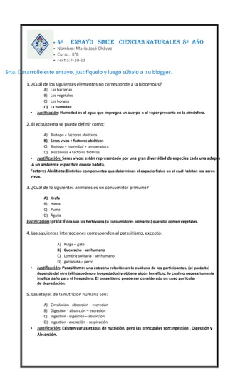 Este documento contiene 29 preguntas de opción múltiple sobre conceptos de biología como ecosistemas, cadenas alimentarias, nutrición humana e interacciones biológicas. Cada pregunta viene acompañada de una justificación de la respuesta correcta. El documento evalúa conceptos clave de ciencias naturales de 8° año.