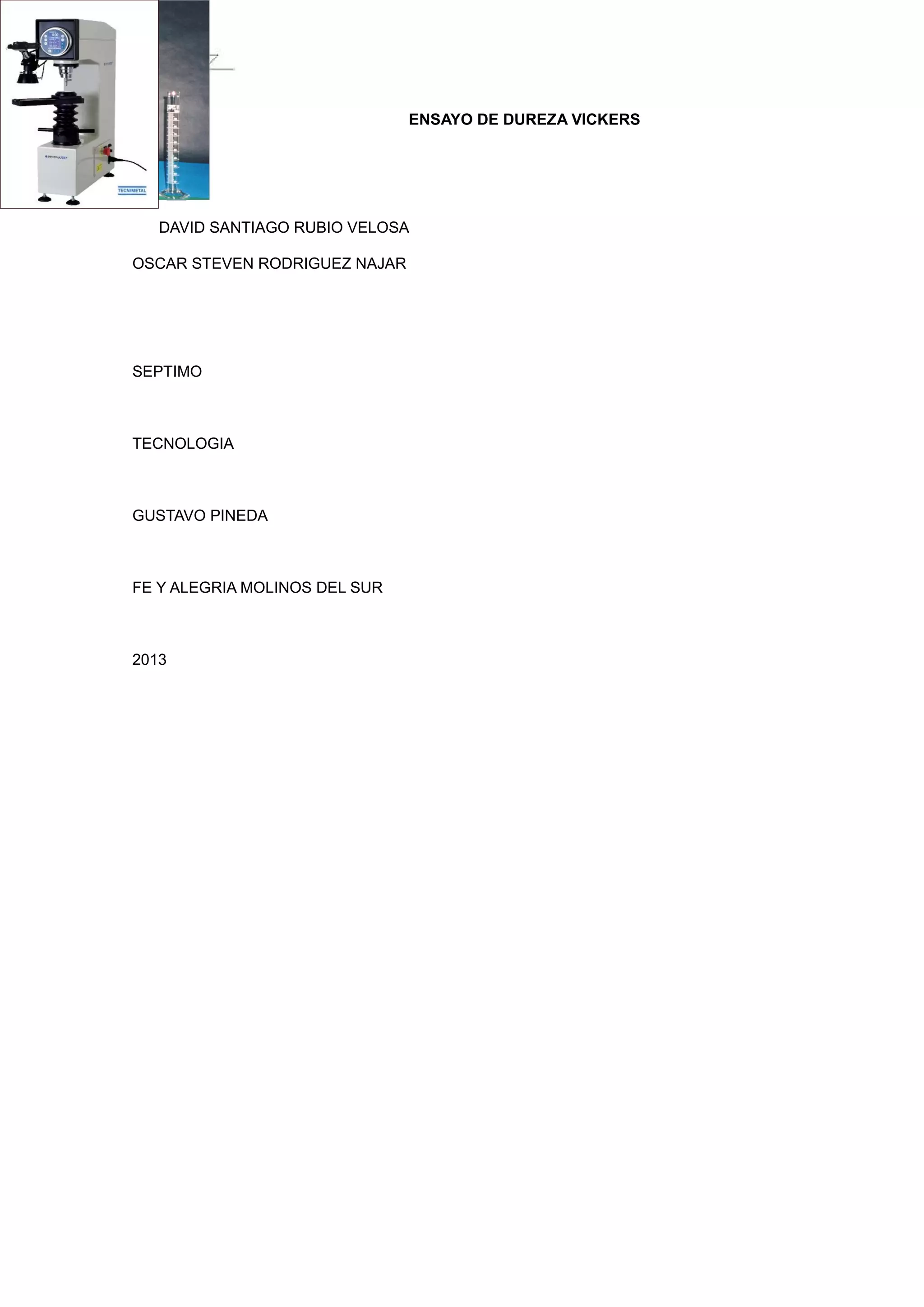 Este documento describe el ensayo de dureza Vickers, incluyendo los principios, aparatos, procedimientos y piezas de ensayo necesarios. La dureza Vickers se mide aplicando una carga controlada a través de un penetrador de diamante de base cuadrada sobre la superficie de una probeta y midiendo las diagonales de la huella resultante. El documento explica cómo preparar y colocar correctamente la probeta, aplicar la carga de forma controlada, y medir e informar los resultados de dureza obtenidos.
