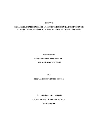 El documento discute el compromiso de las instituciones educativas con la formación de nuevas generaciones y la producción de conocimientos. Argumenta que las instituciones deben enfocarse en desarrollar estudiantes integrales a través de su proyecto educativo, y motivar la investigación para formar nuevos investigadores. También enfatiza la importancia de fortalecer los vínculos con otras entidades para ampliar las oportunidades de producción de conocimientos, y utilizar las nuevas tecnologías para convertir a los estudiantes en emisores de conocimiento