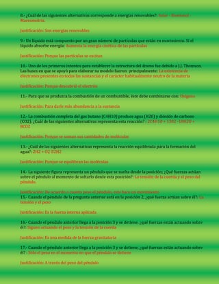 Este documento contiene las respuestas y justificaciones de Nicole Alejandra Muñoz Duarte a 42 preguntas de un examen de 8° grado sobre diversos temas científicos como química, física y biología. Las respuestas muestran los conceptos fundamentales de cada pregunta y las justificaciones explican brevemente la lógica detrás de cada respuesta.