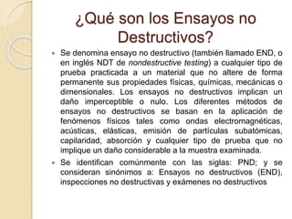 Este documento describe los ensayos no destructivos, específicamente los líquidos penetrantes y las pruebas de fuga. Explica que los ensayos no destructivos evalúan materiales sin dañarlos de forma permanente utilizando métodos como ondas electromagnéticas o acústicas. Describe el proceso y características de los líquidos penetrantes y algunos métodos comunes para realizar pruebas de fuga.