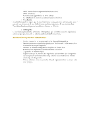 El documento define un ensayo como un texto en prosa que analiza y argumenta sobre un tema específico. Explica que los ensayos académicos requieren una profundización teórica sobre un tema y presentar un punto de vista novedoso. Detalla las características clave de un ensayo como no tener una extensión fija y ser personal pero riguroso. Finalmente, describe los puntos principales que debe contener un ensayo académico como introducción, desarrollo, conclusión y bibliografía.