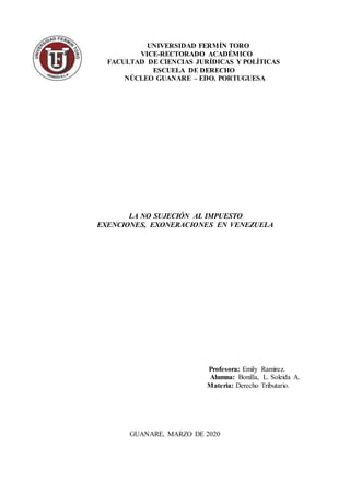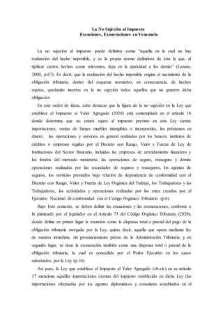 El documento resume las definiciones de exención, exoneración y no sujeción según la Ley del Impuesto al Valor Agregado de Venezuela. Explica que la exención es una dispensa total o parcial del impuesto otorgada por ley, mientras que la exoneración es una dispensa concedida por el poder ejecutivo. También destaca que la no sujeción significa que el hecho no está gravado por el impuesto. El documento ilustra ejemplos de exenciones y exoneraciones contempladas en la ley.