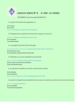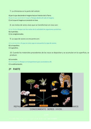 Este documento contiene preguntas sobre la Tierra y los seres vivos. La primera parte presenta 10 preguntas sobre conceptos básicos de la geosfera, como las capas internas de la Tierra, la erosión, los volcanes y terremotos. La segunda parte también tiene 10 preguntas relacionadas con características y funciones de los seres vivos, incluyendo nutrición, fotosíntesis y las partes de las plantas. Al final se entrega la clave de respuestas correctas.