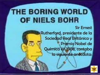 Este documento narra una anécdota sobre Niels Bohr cuando era estudiante. Se le pidió resolver un problema de física que consistía en determinar la altura de un edificio usando un barómetro. Aunque su primera respuesta era correcta, dio otras respuestas más creativas que demostraban su capacidad de pensar de forma no convencional. Finalmente, se revela que Niels Bohr fue un importante físico danés y pionero de la teoría cuántica.