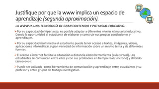El documento discute cómo la World Wide Web (WWW) puede servir como un espacio de aprendizaje. La WWW permite adaptar material educativo a diferentes niveles a través de hipertexto, dando a los estudiantes la oportunidad de elaborar sus propias conclusiones. También permite el acceso a múltiples medios como texto, imágenes y video sobre un tema. La WWW facilita la educación a distancia a través de aulas virtuales donde los estudiantes pueden comunicarse de forma síncrona y asíncrona con profesores y compañ
