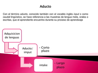 Este documento habla sobre el concepto de intake en el aprendizaje de una segunda lengua. El intake se refiere a las muestras de lengua que el estudiante encuentra y procesa durante el aprendizaje. Solo una parte del input es almacenada a largo plazo como conocimiento lingüístico. El estudiante presta atención a ciertas características del input como su dificultad o frecuencia. Luego compara esto con su propia producción para identificar diferencias y así reestructurar su conocimiento. Sin embargo, la interiorización