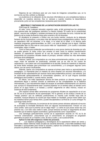 El documento habla sobre la enseñanza de las TIC y la capacitación de docentes. Señala que los docentes latinoamericanos a veces sienten temor al usar computadoras y recursos tecnológicos debido a su poca familiaridad con la tecnología. Sin embargo, cuando los docentes experimentan el uso de las TIC en el aula, observan comportamientos positivos en los estudiantes como la motivación, y reconocen las oportunidades que brindan estas herramientas para hacer sus clases más accesibles y dinámicas. El autor