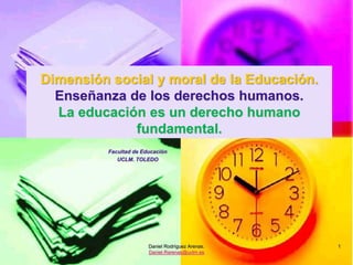 Este documento trata sobre la enseñanza de los derechos humanos. Explora conceptos como la naturaleza innata y universal de los derechos humanos, las características de la infancia que son importantes para la enseñanza, y modelos educativos inclusivos versus excluyentes. También discute estrategias para manejar conflictos de manera positiva y crear un clima escolar que promueva los derechos humanos.