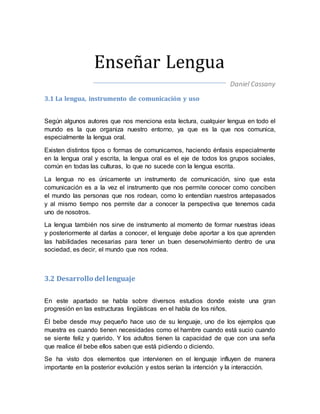 Este documento resume los principales puntos sobre el desarrollo del lenguaje, la alfabetización y la enseñanza de la lectura y escritura. Explica que el lenguaje es fundamental para la comunicación y el desarrollo cognitivo de los niños. También describe diferentes métodos para enseñar a leer, como los basados en códigos y los basados en el sentido. Además, señala que los niños deben alcanzar ciertos hitos de desarrollo antes de los 6 años para aprender a leer de manera significativa.