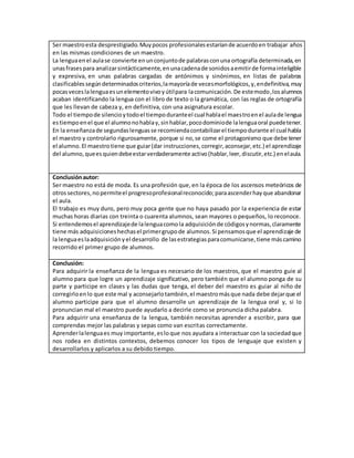 Este documento resume el capítulo 1 de un libro sobre la enseñanza de la lengua. Describe algunos de los desafíos actuales en la enseñanza de la lengua, incluyendo el analfabetismo funcional, la falta de motivación de los estudiantes y maestros, y la necesidad de que los maestros mejoren su formación metodológica y actualicen sus conocimientos. También discute la importancia de que los maestros sirvan como buenos modelos lingüísticos y que la enseñanza de la lengua se centre más en