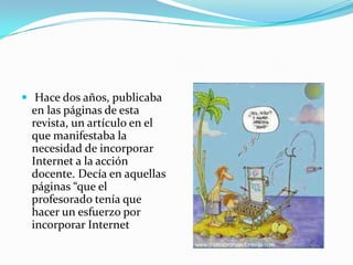 El documento discute las dificultades y desafíos de incorporar Internet en las aulas de secundaria, incluyendo problemas de infraestructura, limitaciones de tiempo y dificultades de uso. También analiza las dudas de los profesores sobre cómo Internet podría afectar el aprendizaje de los estudiantes y sus roles como instructores. La mayoría de los profesores consideran que Internet es un recurso útil para material complementario, pero solo una minoría cree que también puede apoyar el autoaprendizaje.