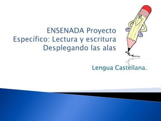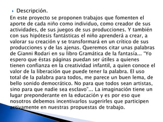 Este documento propone proyectos para fomentar la creatividad de los niños y su participación activa en actividades de lengua castellana. Se enfatiza la importancia de desarrollar la imaginación y permitir que los niños creen y critiquen sus propias producciones. El objetivo es desarrollar las habilidades de lenguaje oral y escrito desde una edad temprana a través de lectura de cuentos, poesías e historietas, y producciones escritas individuales y grupales usando diferentes técnicas.