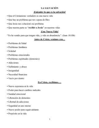 Este documento explica los conceptos fundamentales de la salvación cristiana. Explica que todos los seres humanos son pecadores separados de Dios, pero que Jesús murió para pagar el castigo por los pecados. Para recibir la salvación, una persona debe aceptar a Jesús como Señor mediante la fe, lo que resulta en un nuevo nacimiento espiritual y una relación personal con Dios.