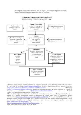El documento aborda la webquest, una estrategia de aprendizaje basada en la indagación a través de internet que integra principios constructivistas y metodologías de enseñanza por proyectos. Esta metodología promueve el aprendizaje cooperativo, la investigación y el desarrollo de habilidades como el pensamiento crítico a través de la realización de tareas concretas que implican el uso de recursos en línea. Además, se describen los componentes esenciales de una webquest y su proceso de creación, resaltando su flexibilidad y aplicabilidad en contextos educativos.