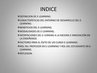 Este documento describe el e-learning y sus características. Define el e-learning como el uso de la tecnología de Internet para la enseñanza y el aprendizaje. Explora los beneficios del e-learning como el aprendizaje en cualquier momento y lugar, la formación más efectiva, y la reducción de costos. También discute las modalidades de e-learning como el aprendizaje sincrónico y asincrónico, tutorizado y autodirigido. Finalmente, destaca factores clave para el éxito del e-learning como un diseño del curso a