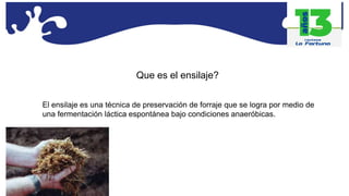El ensilaje es una técnica de preservación de forraje que mantiene su valor nutritivo a través de una fermentación láctica anaeróbica. El objetivo es conservar los forrajes cosechados en su mejor momento, entre un 30-35% de humedad, cortados en trozos pequeños de 0.5 a 1.5 cm. Para lograr una buena fermentación, es importante compactar bien el forraje en el silo para eliminar el aire y sellarlo herméticamente con plástico para prevenir la entrada de oxígeno
