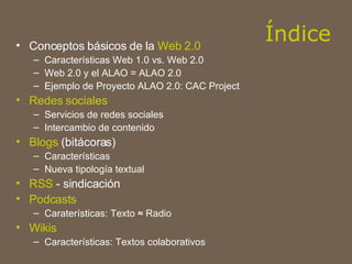Este documento describe las características y posibilidades educativas de la Web 2.0 para la enseñanza de idiomas. Explica conceptos como blogs, wikis, podcasts y redes sociales y cómo pueden usarse para crear entornos de aprendizaje colaborativo e interactivo centrados en el alumno. Finalmente, anima a los lectores a explorar el potencial de estas herramientas para mejorar la enseñanza de idiomas aprovechando su capacidad para la comunicación y construcción compartida de conocimiento.