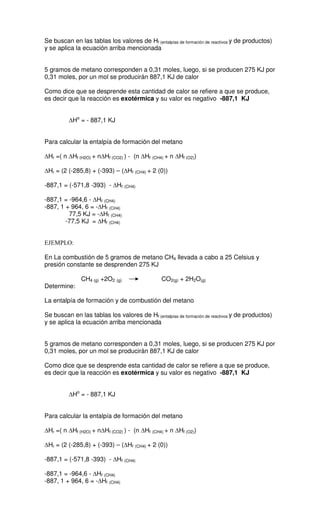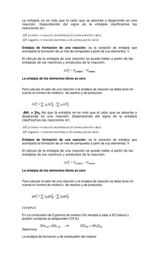 La entalpía es el calor absorbido o desprendido en una reacción química. Dependiendo del signo de la entalpía, las reacciones se clasifican como exotérmicas o endotérmicas. La entalpía de una reacción puede calcularse a partir de las entalpías de formación de los reactivos y productos involucrados. El documento proporciona un ejemplo numérico del cálculo de la entalpía de formación y combustión del metano a partir de datos experimentales.