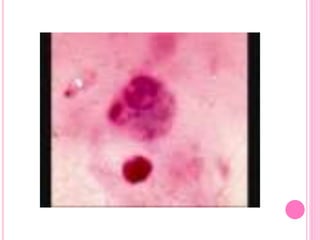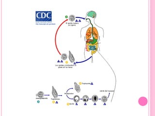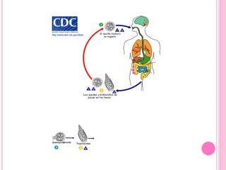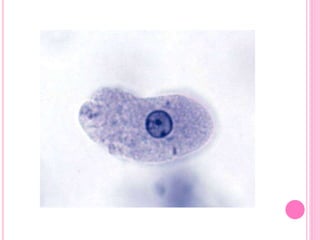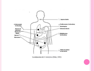 La Entamoeba histolytica es un parásito protozoario que puede presentarse en forma de trofozoíto, quiste o metaquiste. El trofozoíto existe en forma minuta no patógena o forma magna altamente patógena que se alimenta por fagocitosis e ingiere glóbulos rojos. El quiste es la forma infectante con alta resistencia que contiene 1-4 núcleos y da origen a los trofozoítos.