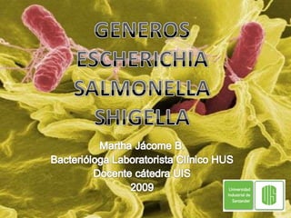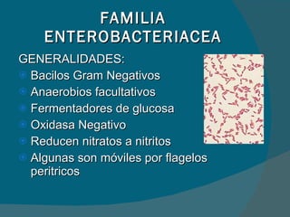 El documento describe las características generales de la familia Enterobacteriaceae, incluyendo su estructura antigénica y mecanismos de patogenicidad. Luego se enfoca en Escherichia coli, Salmonella y Shigella, detallando sus grupos patogénicos, ciclos de infección, diagnóstico, tratamiento y prevención.
