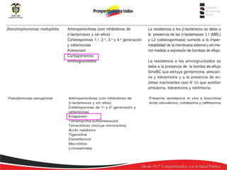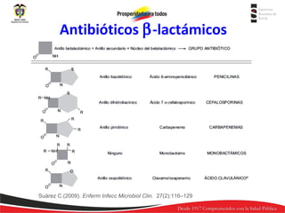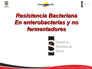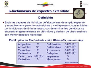El documento aborda la resistencia bacteriana en enterobacterias y no fermentadores a los antibióticos β-lactámicos, destacando los mecanismos de resistencia como las betalactamasas y la alteración de la permeabilidad de la membrana. Se presenta una clasificación de las betalactamasas, así como detalles sobre las carbapenemasas, incluyendo su diseminación en Colombia. Además, se mencionan pruebas de laboratorio para detectar betalactamasas de espectro extendido y otras variantes.