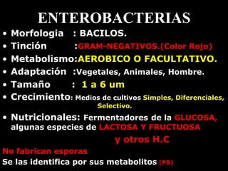 1) Las enterobacterias son bacilos gramnegativos aerobios o facultativos que se encuentran en plantas, animales y el hombre. Incluyen géneros como Escherichia, Klebsiella y Salmonella.