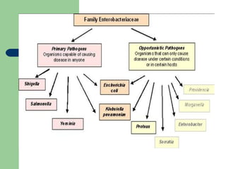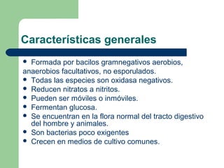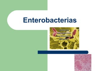 El documento describe las características generales de las enterobacterias, incluyendo que son bacilos gramnegativos aerobios o anaerobios facultativos que fermentan glucosa. Se clasifican en patógenas u oportunistas. Poseen tres tipos de antígenos: somático, flagelar y capsular. Se enfoca luego en Salmonella, indicando que son anaerobios facultativos móviles que pueden causar infección al invadir el intestino y la sangre luego de ingestión. Menciona nueve especies de Salmonella.