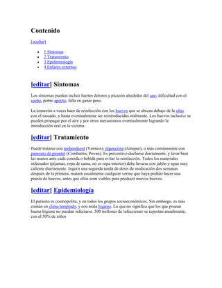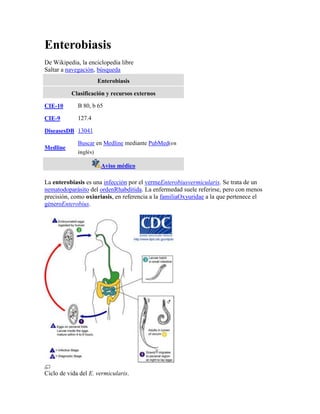 La enterobiasis es una infección común causada por el parásito Enterobius vermicularis. Los síntomas incluyen comezón alrededor del ano y dificultad para dormir. Se transmite fácilmente entre personas y afecta a cientos de millones cada año, especialmente niños. El tratamiento implica medicamentos como mebendazol y buenas prácticas de higiene.
