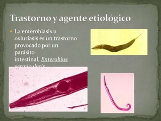 La enterobiasis es causada por el parásito Enterobius vermicularis. Provoca picazón en la zona anal y se transmite a través del contacto manual-oral o de objetos contaminados con huevos del parásito. El diagnóstico se realiza mediante la prueba de la cinta adhesiva para detectar huevos u adultos del parásito en la zona perianal.